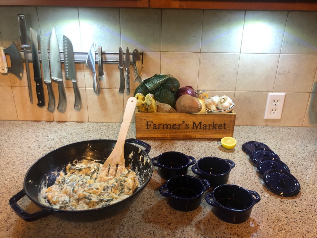 Once the pan is warm but not hot, add the cream cheese, mayonnaise, lemon juice, and salt and pepper and stir. Add 3/4 cup of the Italian Blend cheese and stir. Now You’re ready to dish it up! Spray your baking dish or dishes with olive oil (lids too) before filling.