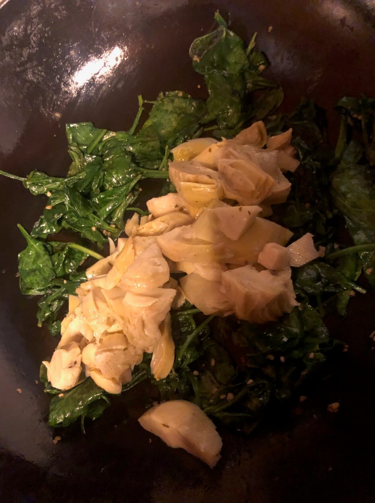 Add the spinach and keep the burner on low. Toss occasionally for consistency. Meanwhile, chop the artichoke hearts into smaller pieces.